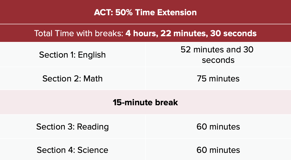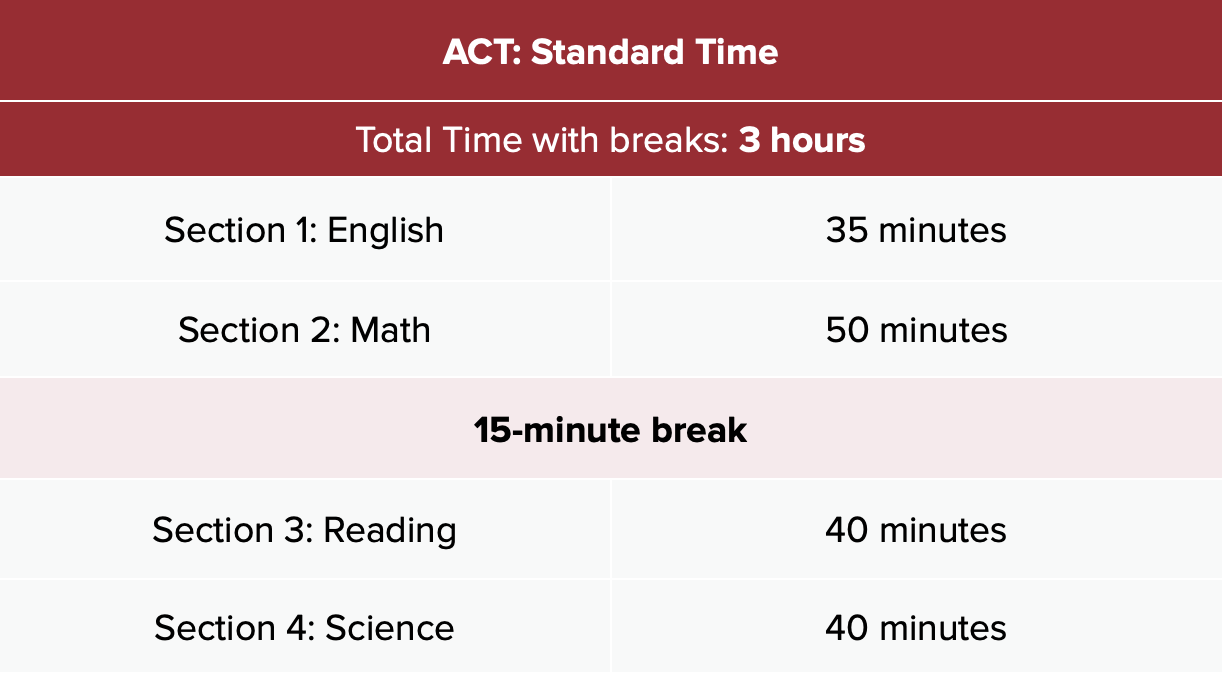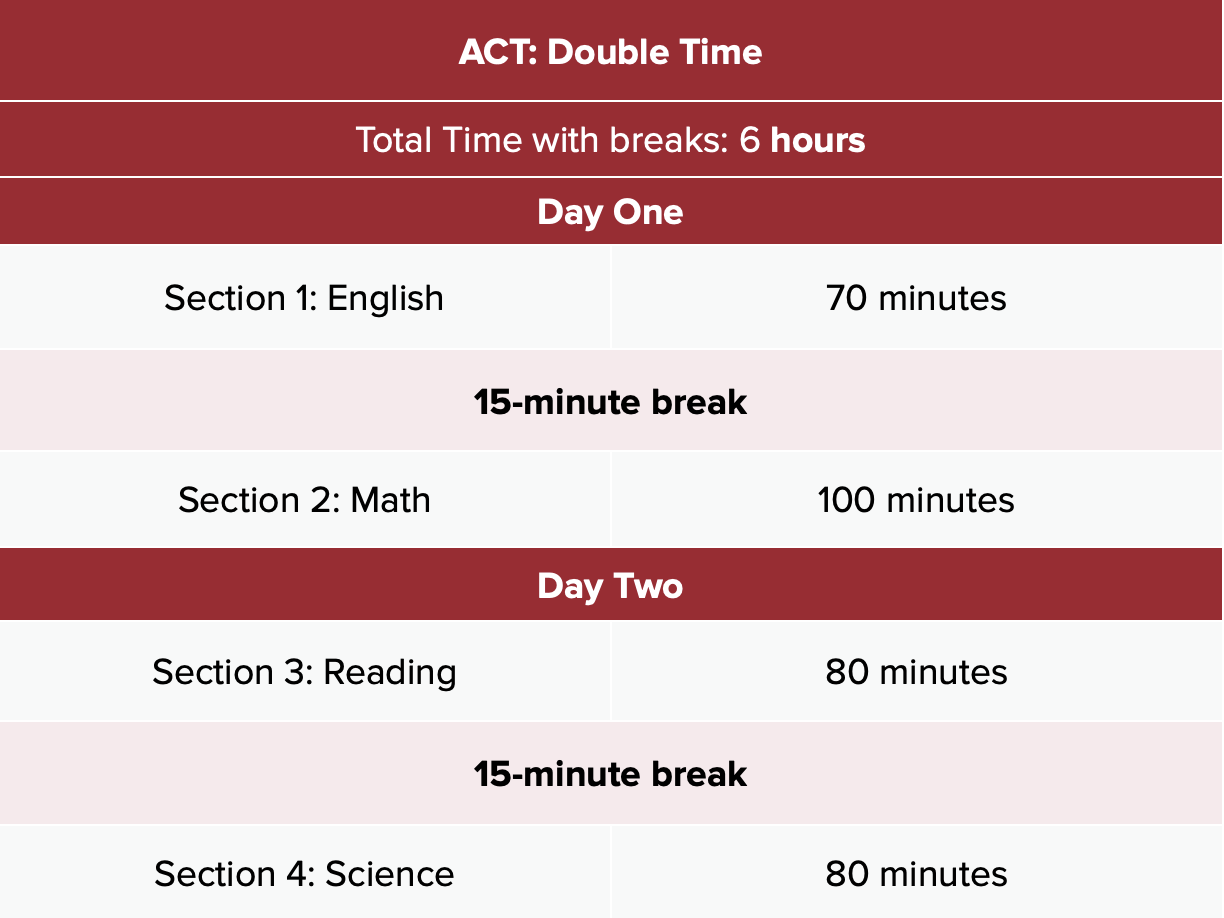 The ACT with double time is generally administered over two days. If you are taking the practice test in one day, take a fifteen minute break between videos.