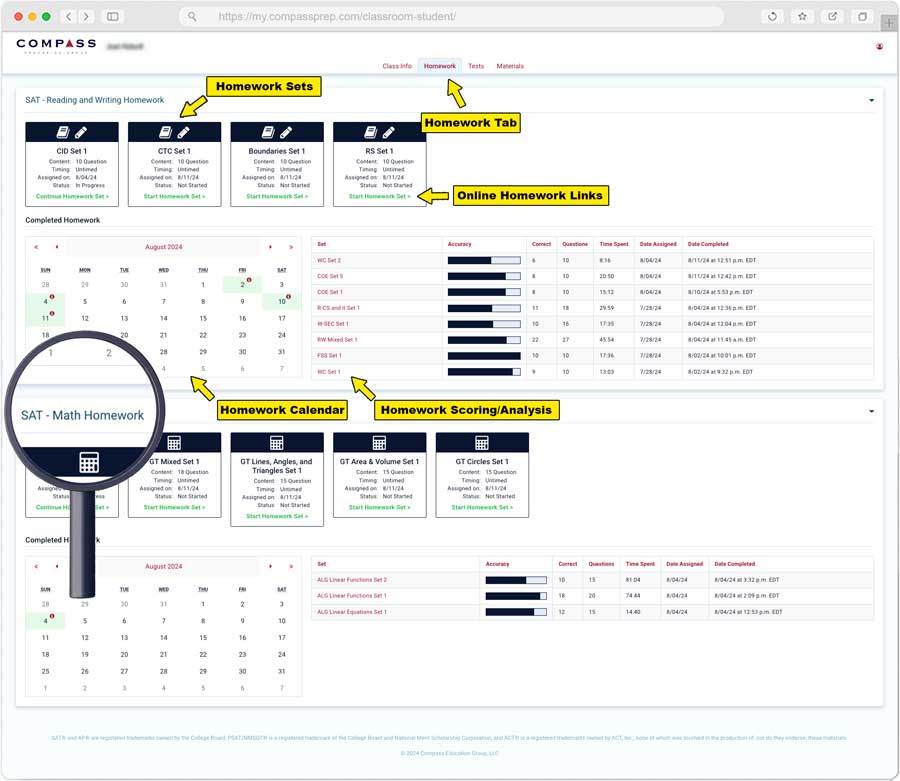 Your Compass account holds everything you need to successfully complete your class: schedule, instructor contact info, class notes and videos, homework, practice tests, and digital materials.