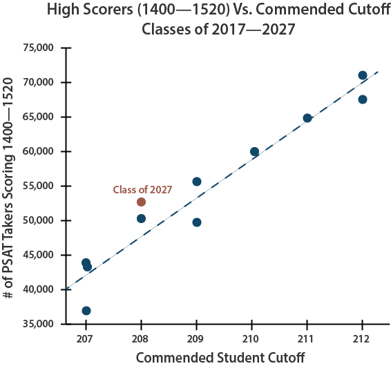 College Board does not release any information about the distribution of Selection Indexes, but it does produce summaries of broad score ranges. The number of students in the 1400 – 1520 Total Score range has proved to be an excellent indicator of the Commended cutoff. The Class of 2027 saw 16% fewer top scores than did last year’s class. The 52,400 students at 1400 and above is closer to what we saw two years ago with the Class of 2025 and, going back further, similar to the results for the Classes of 2017 and 2021. [Figure updated to reflect that we now know that the Commended cutoff is 208.]