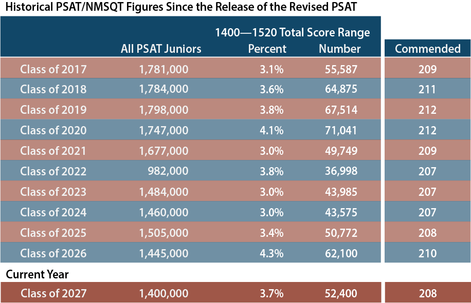 The junior year PSAT is also the NMSQT — the National Merit Scholarship Qualifying Test. Each year, National Merit recognizes the top 57,000 test takers. In order to be included in that group, students need to be among the top 4% of the 1.4 million students who take the PSAT. Of that elite group, approximately 17,000 are recognized as Semifinalists for having the highest scores within their states. Semifinalists have the opportunity to continue in the program to become Finalists and, potentially, scholarship recipients. The remaining 40,000 students are recognized as Commended Students. More information can be found in our National Merit Explained post.