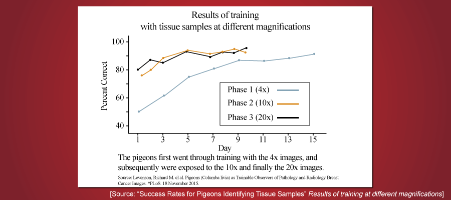 Only the note at the bottom of this graph lets you know that it doesn’t measure the accuracy of three groups of pigeons. This is one group of pigeons going through three rounds of training.